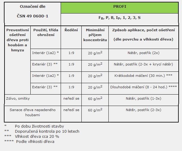 Ochrana nových nebo zabudovaných dřevěných prvků a konstrukcí v interiérech (např. trámové stropy, konstrukce krovů, podlahy) a v exteriérech bez přímého a trvalého kontaktu se zemí (např.roubené stavby a sruby, zahradní chaty, altány, pergoly, ploty, střešní podbití apod.).