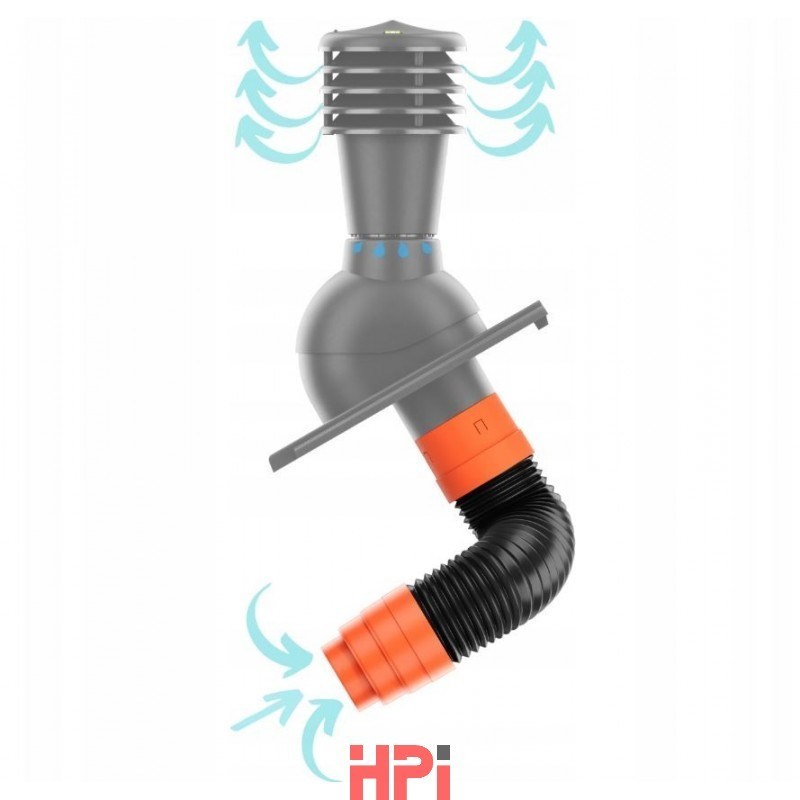 Flex-hadice o 125 je určena pro napojení větracího komínku k vývodu odvětrání interiéru, kanalizace apod. Flexibilní konstrukce umožňuje v případě potřeby napojení mimo osu komínku.