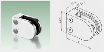 oblý klip na skleněnou výplň, možnost bez vrtání skla, součástí klipu je i gumové těsnění dle dané tloušťky skla AISI 304 – austenitická chromniklová ocel odolná proti vodě, vodní páře, vlhkosti vzduchu, jedlým kyselinám i slabým organickým a anorganickým