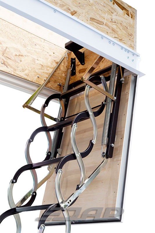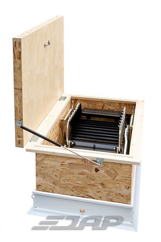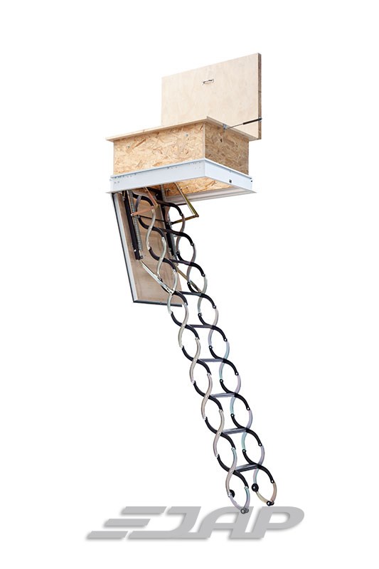 - Tyto stahovací schody jsou zabudovány do stropu, mají sendvičové víko se složenými kovovými schůdky.