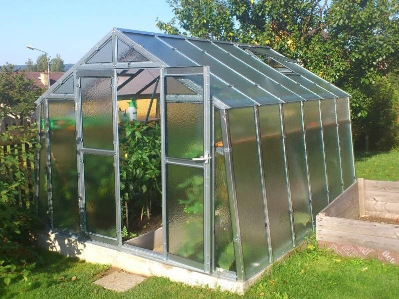 Popis: Boční stěny skleníku jsou mírně šikmé. Odolná konstrukce vhodná do míst s nepříznívými podmínkami.
