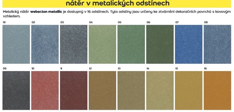 Fasádní nátěr v metalických barevných odstínech, obsahující akrylátovou disperzi, připravený k přímému použití se systémovou penetrací weber.podklad A. Fasádní nátěr v metalických barevných odstínech je určený k barevnému ztvárnění dekorativních prvků a ploch na nových fasádách, ale i při jejich rekonstrukcích, modernizacích a renovacích. Je vhodný k natírání na všechny typy tenkovrstvých omítek. Nátěr je vyráběn 16 barevných odstínech podle vzorkovnice weber.ton metallic. Tyto odstíny jsou určeny ke ztvárnění dekoračních povrchů s kovovým vzhledem.